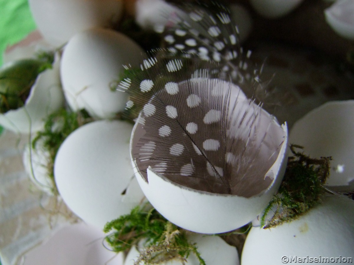 Die kleinen Perlhuhnfedern schmücken dann zum Beispiel den Osterkranz aus der Tischdeko der letzten Woche.