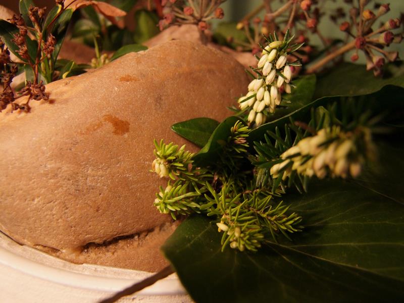 Die Zwischenräume fülle ich mit Efeufrüchten, Heide und Buchsbaum aus dem Garten.